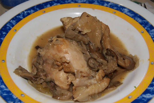 Cortamos las setas en trozos y picamos los ajos. Lo añadimos a la cacerola y dejamos que se cocine todo otros diez minutos. Sazonamos e incorporamos el pollo de nuevo, junto con el tomillo y romero al gusto.