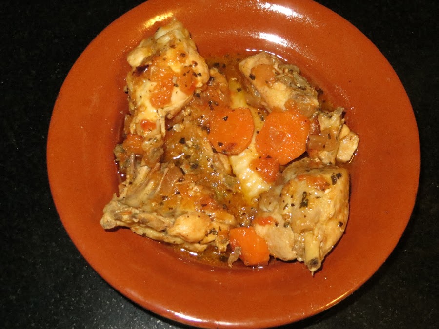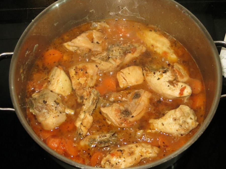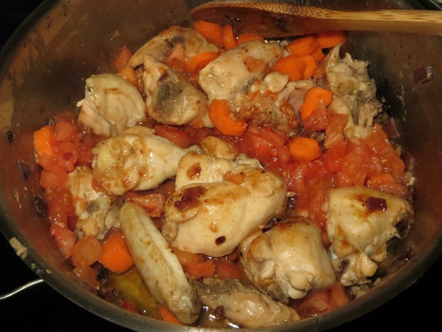 Cuando el pollo esté dorado añadimos la zanahoria en rodajas y los tomates pelados y picados. Añadimos el vino blanco y esperamos a que dé un hervor y echamos el agua, también puede ser con caldo de pollo, lo que le dará más contundencia al guiso.