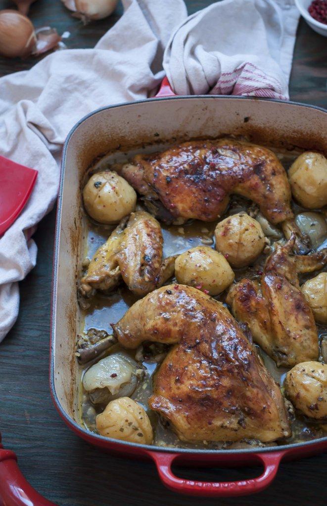 Pollo a la cerveza con mostaza antigua y pimienta rosa