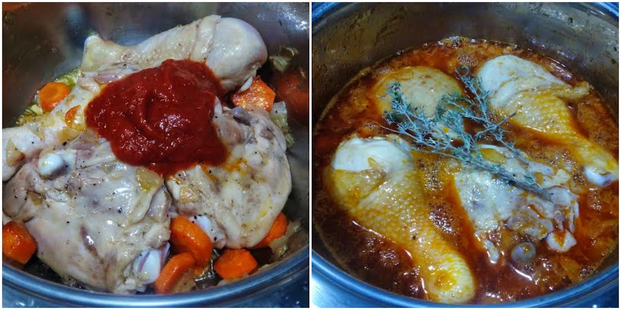 Añadimos el tomate, mezclamos todo bien y vertemos la cerveza y el tomillo. Cocinamos a fuego medio unos 30-40 minutos, hasta que el pollo esté hecho y la salsa haya reducido.