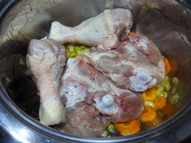 Cuando estén doradas las verduras agregamos el pollo salpimentado y lo marcamos.