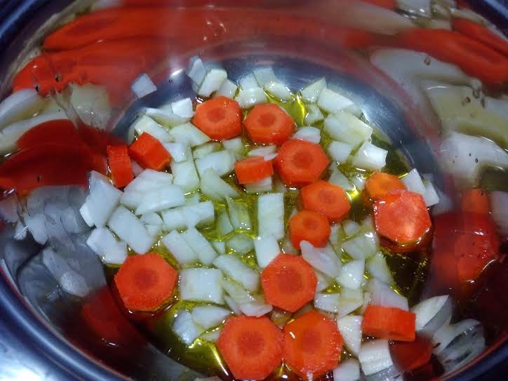 AOVEEn una cazuela ponemos un buen chorro de aceite y sofreímos la cebolla y la carlota picadas.