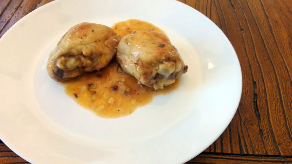 Regresamos el pollo a la sartén, subimos el fuego, echamos el chupito de brandy y, cuando evapore el alcohol, bajamos de nuevo a fuego medio.
