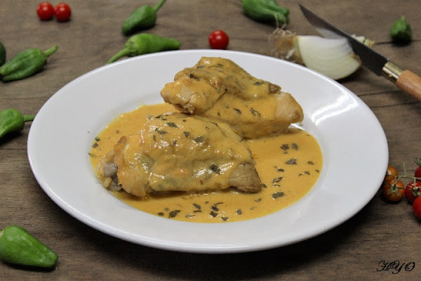 4. Podemos servir tal cual el pollo, o si lo preferimos, trituramos la salsa con una batidora. Presentamos el plato regando los trozos de pollo con salsa y espolvoreando perejil picado por encima.