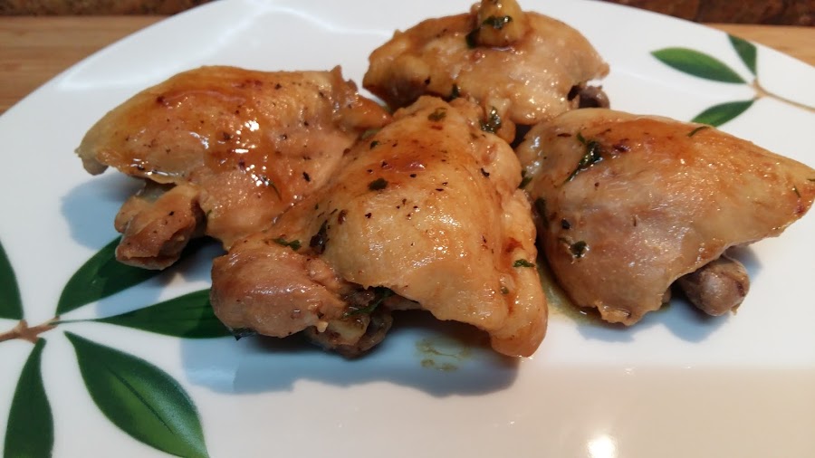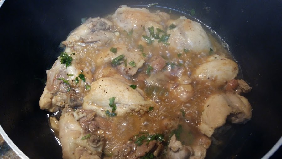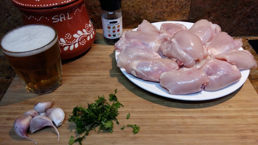 1kg de pollo troceado, 4 dientes de ajo, 1 vaso de cerveza, 2 cucharadas de aceite de oliva, perejil, pimienta negra molida y sal.