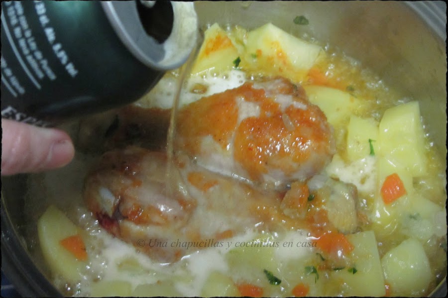 Cuando ya esté doradito el pollo, verter la lata de cerveza.