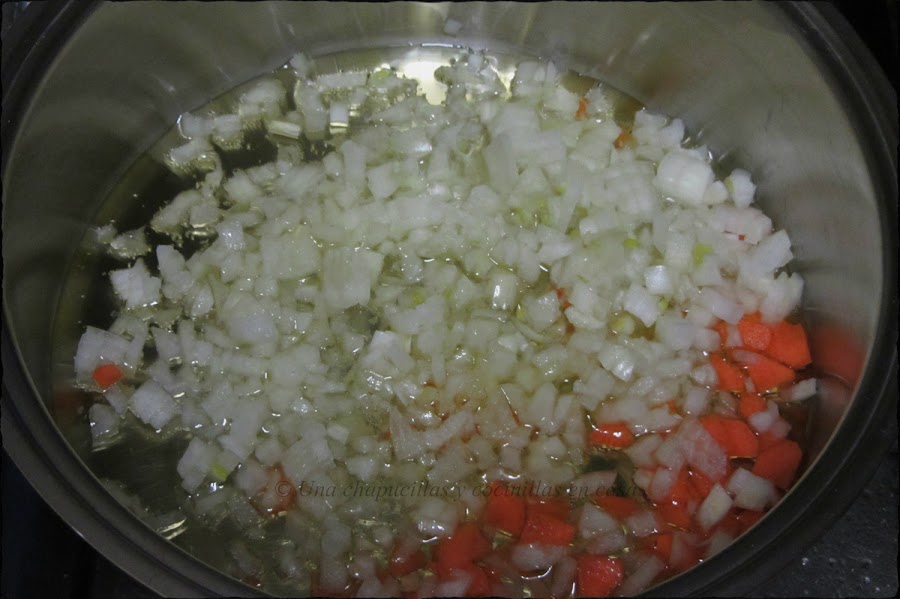 Cortar las verduras en brunoise, el ajo en trocitos y ponerlas a pochar en una cazuela con un chorrito de aceite de oliva. Salpimentar.