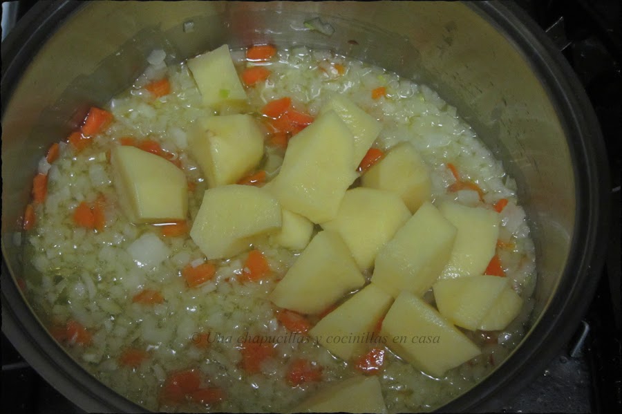 Cuando empiece a tomar color, agregar la patata cortada en trozos.