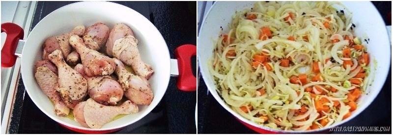 1. El primer paso para esta receta es la de sazonar con sal, pimienta y la mitad del comino los muslos de pollo. Seguidamente los doramos en una cazuela con el aceite a fuego medio-fuerte, cuando estén bien dorados, retiramos y reservamos.