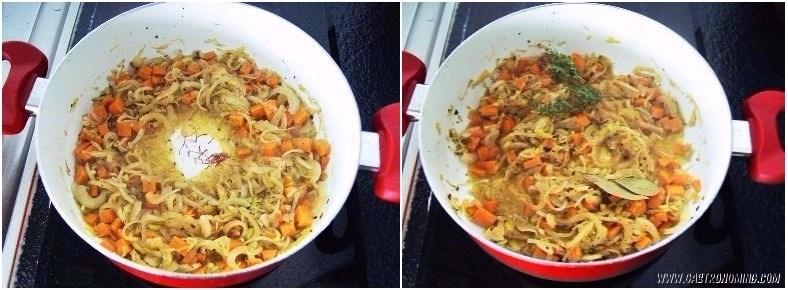 2. En ese mismo aceite vamos añadir la mantequilla para sofreir la cebolla, ajos, puerro, zanahoria, cuando esté la cebolla transparente, apartamos las verduras dejando un agujero en el centro y doramos el azafrán un minuto.
