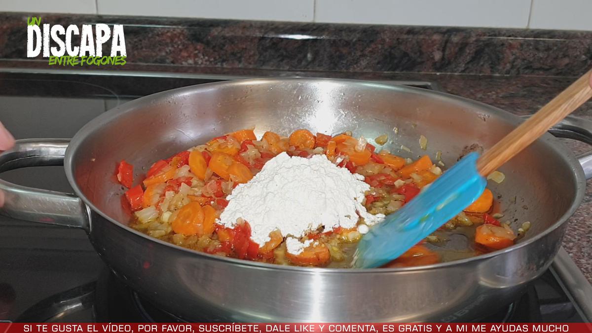 4Cuando las verduras ya están pochadas, añadimos un par de cucharadas de harina, cocinamos la harina durante un par de minutos.