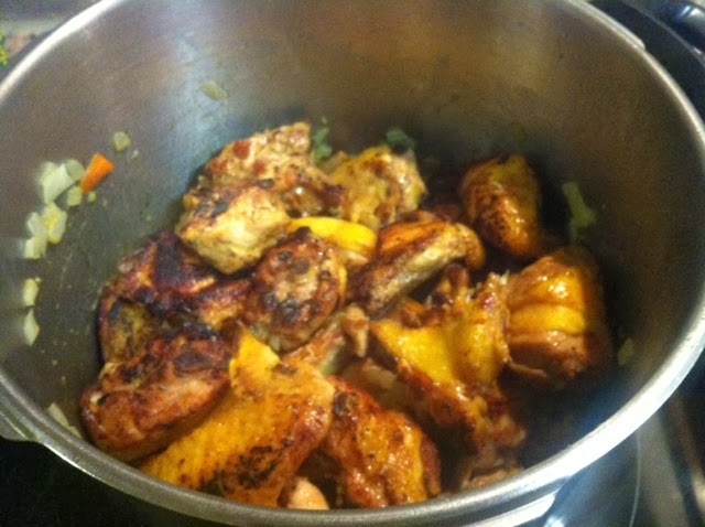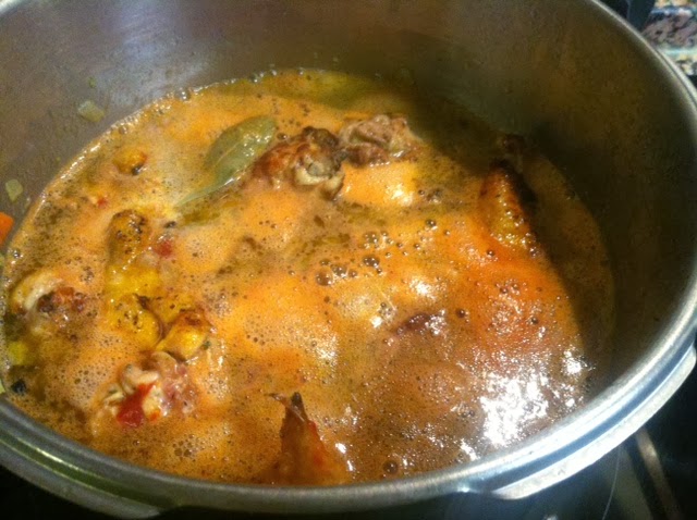Añadir el pollo, las cervezas y el tomate frito y cocer 1 hora aproximadamente (hasta que veais que la carne se despega del hueso del pollo).