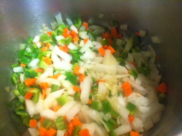 Por otro lado, en una olla con 4 cucharadas de aceite (aprox), ponéis a fuego medio a pochar la cebolla, el pimiento verde y la zanahoria cortados en brunoise (cuadraditos).