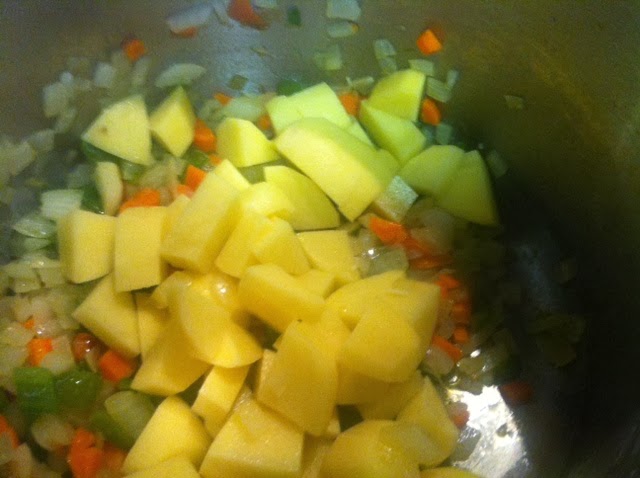 Pochar durante unos 10 minutos, removiendo de vez en cuando e incorporar las patatas peladas, lavadas y cortadas en cuadrados y rehogar durante un par de minutos.