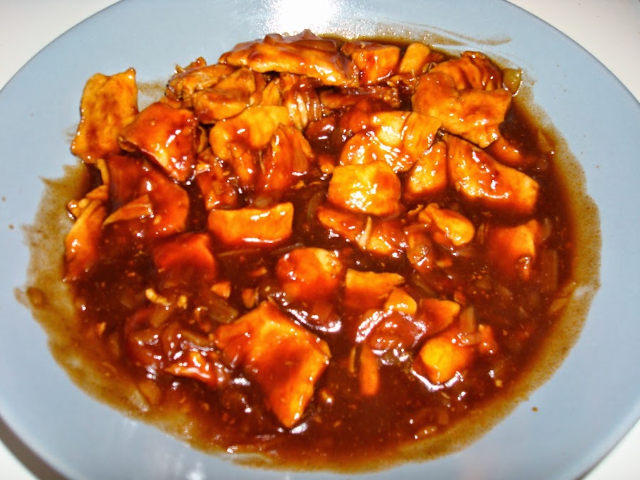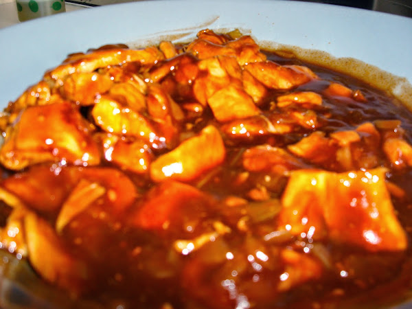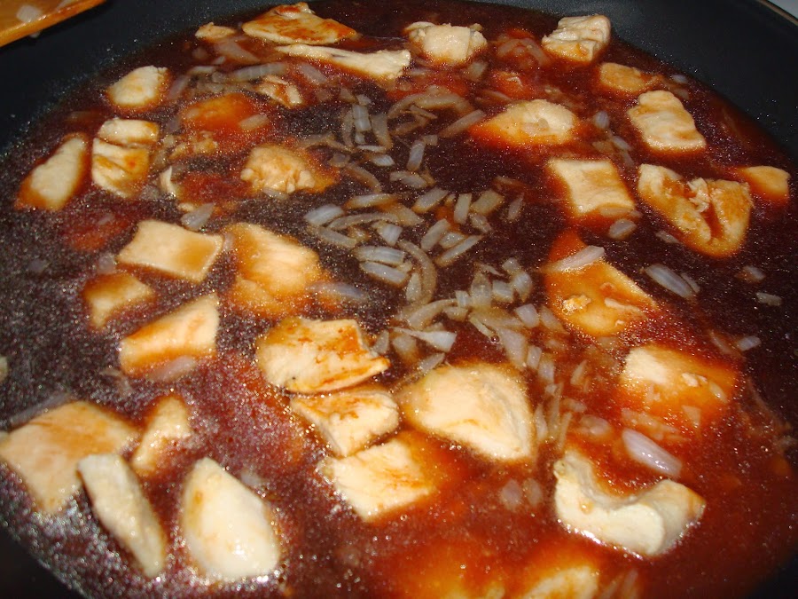 Y por fin terminamos.Apartamos del fuego en pollo en salsa de coca-cola y servimos con guarnición de patatas fritas.