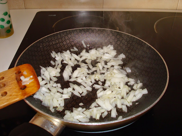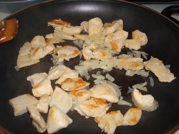 En primer lugar se pica el cebollino y se trocean los filetes de pechuga. En una sartén ponemos a sofreír el cebollino y cuanto esté dorado apartamos.