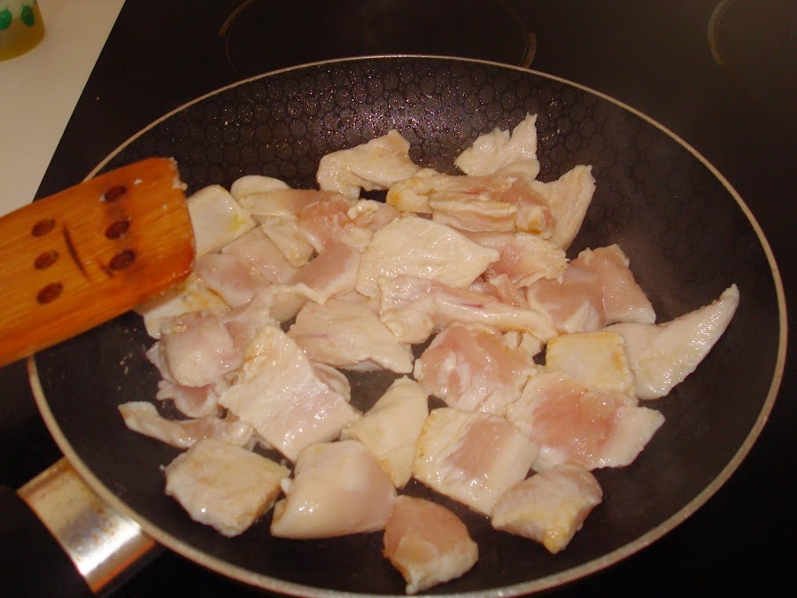 En segundo echamos sal y ajo en polvo a los trocitos de pechuga y los freímos hasta que estén un poco doraditos y apartamos