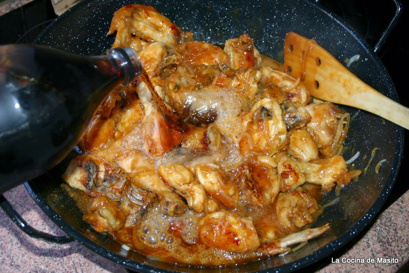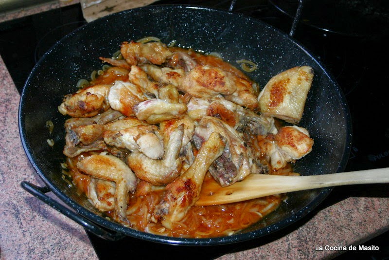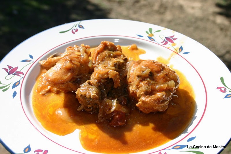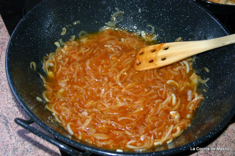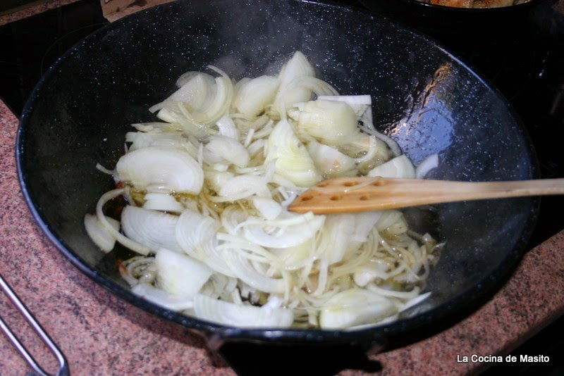 picais la cebolla en juliana y en el mismo aceite que hemos usado para freir el pollo pochamo sla cebolla, a fuego medio, que si lo poneis muy alto se os puede quemar y cambiar asi el sabor del guiso
