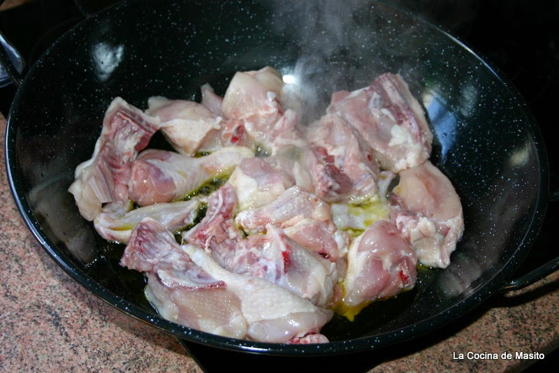 en una fuente amplia, yo use una sarten tipo wok, echais acite y poneis a dorar el pollo( ya salpimentado) cuando ya este dorado, lo sacais y reservais