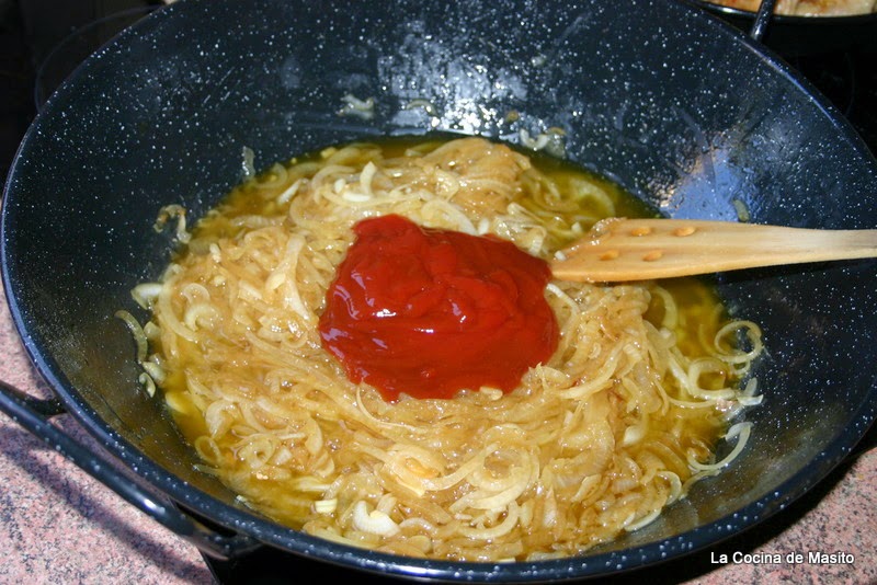 una vez que este bien pochadita añadimos el ketchup, unos 100 gr mas o menos