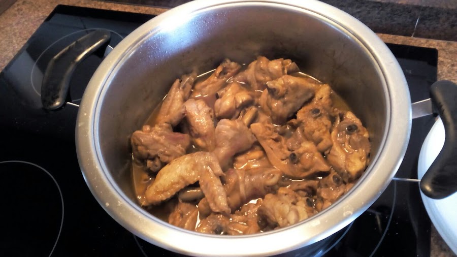 Se deja hervir a fuego medio una hora. Si cuando el pollo ya está bueno todavía hay mucho caldo se sube el fuego para que evapore y reduzca. Tiene que quedar una salsa gordita.