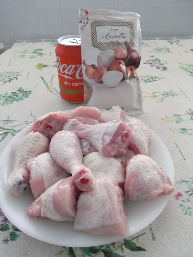 Se pone la cazuela al fuego con un chorrito de aceite, se sala el pollo y se dora. Se añade el contenido del sobre de la sopa, el vaso de Coca cola y un vaso y medio de agua.