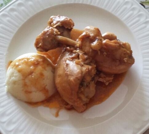 Se pone todo junto en una olla y se cocina a fuego lento hasta que es pollo esté hecho.