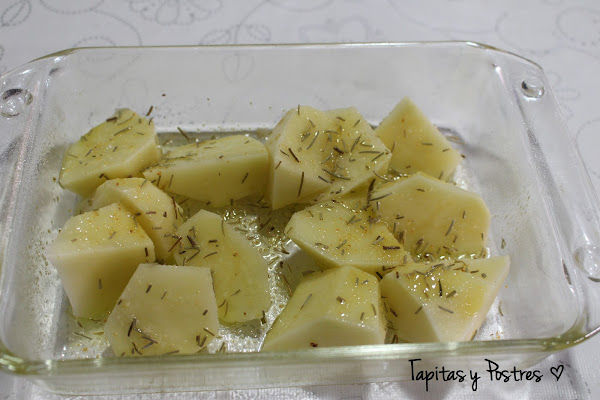 En una fuente aparte ponemos una patata cortada a cuartos. Salamos y espolvoreamos romero seco por encima.Podemos poner también unos dientes de ajo. A mitad de cocción metemos la fuente con las patatas en el horno.