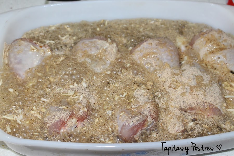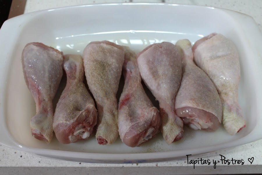Salpimentamos los jamoncitos de pollo y los ponemos en una fuente de horno con un fondo de aceite, poco solo para que no se pegue.