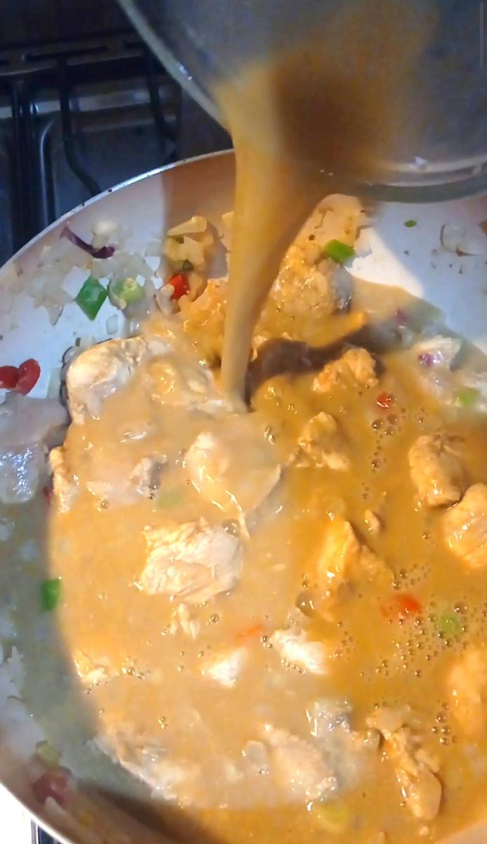 Añadir la mezcla de jugo de naranja y cocinar hasta que el pollo esté listo