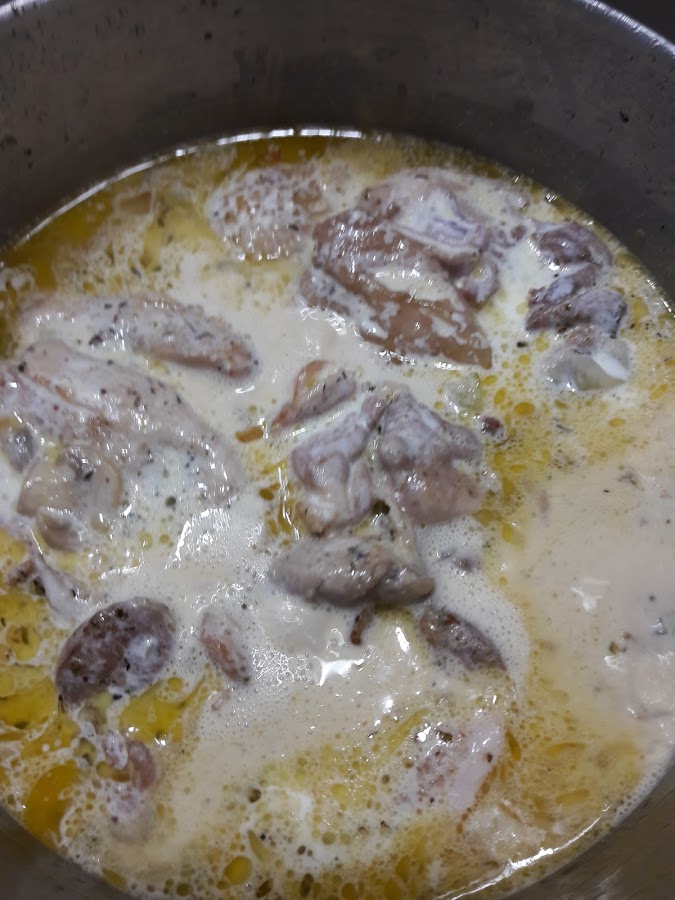 Incorporamos el pollo, cubrimos con la nata (crema de leche) y el caldo, dejamos cocer hasta que ponchemos y veamos que esta blandito...