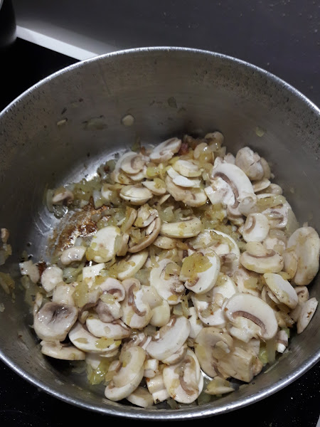 Sofreímos en la cazuela, donde doramos el pollo, fuego medio, mientras se sofríe la cebolla preparamos los champiñones, bien limpios y secos, partimos en láminas gorditas. Los añadimos a la cazuela, los rehogamos un poco, ya con el fuego más alto, acordaros que siempre sueltan agua.