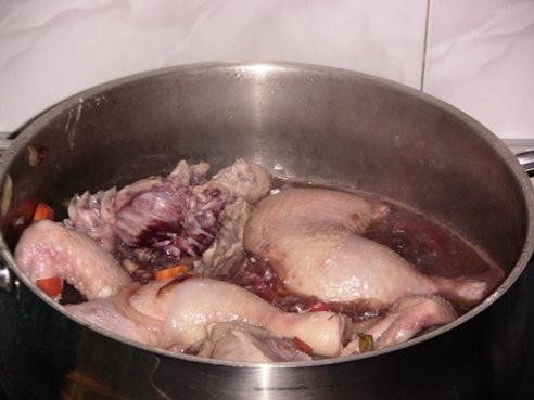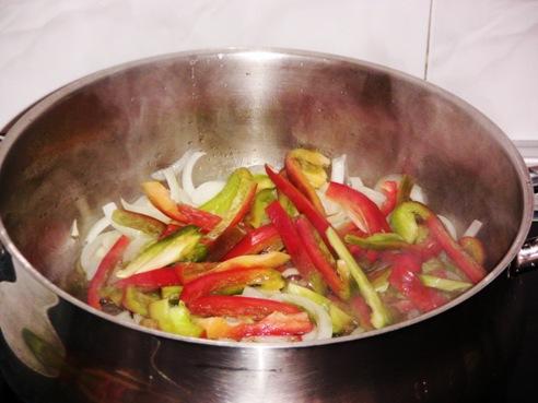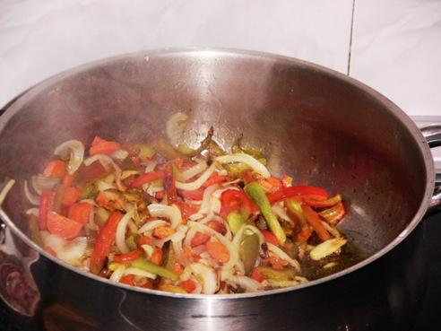 En la cazuela que vayamos a preparar este plato comenzamos cubriendo el fondo con aceite de oliva, añadimos los ajos y la cebolla para dorarlos un poco, añadimos el pimiento y la zanahoria un poco mas tarde y cuando ya vemos que está bien rehogado le ponemos el pollo cortado en trozos para que se fría un poco con la verdura.
