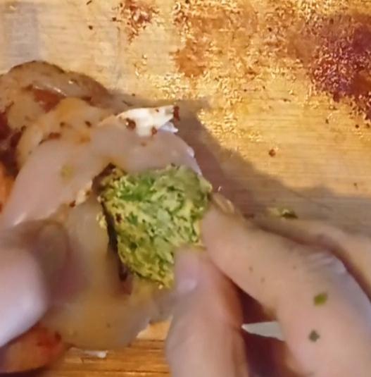 Hacer un corte en el medio de las pechugas formando un hueco, sin abrirlas, e introducir rodajas de la manteca saborizada, cerrar con un palillo.