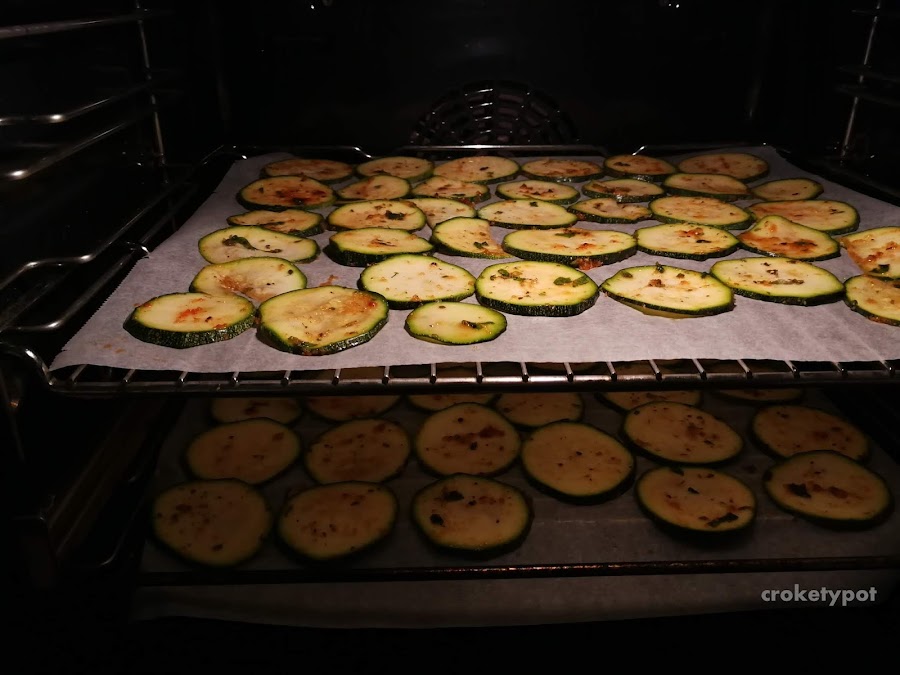 Precalentamos el horno como máximo a 80 grados solo con el aire caliente o el ventilador. Preparamos las rejillas del horno con papel de hornear, ponemos la rodajas de calabacín macerado, no importan que estén juntas por que luego al perder el agua quedan más pequeñas.