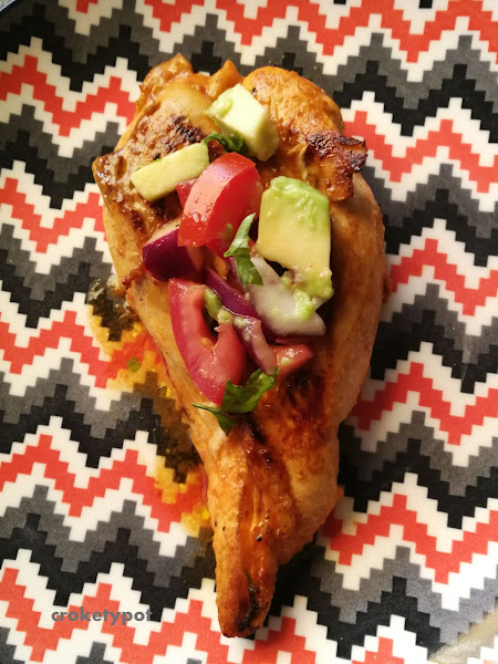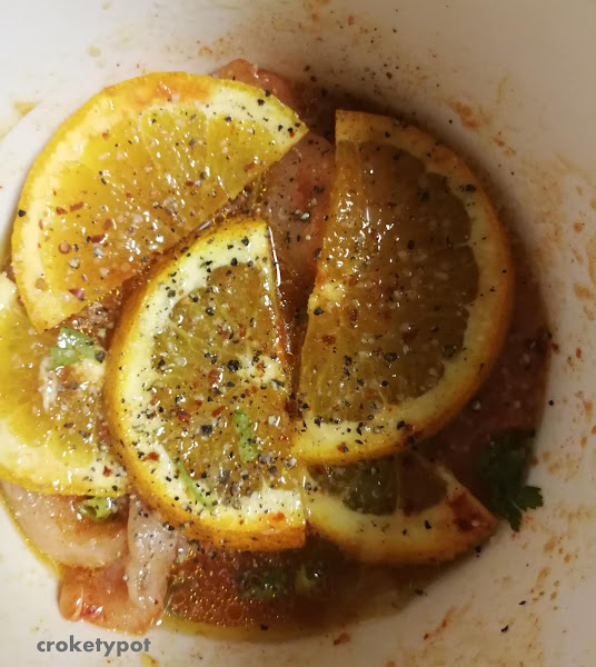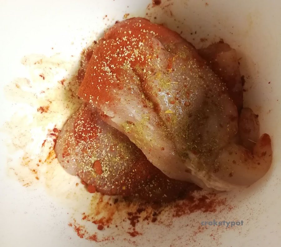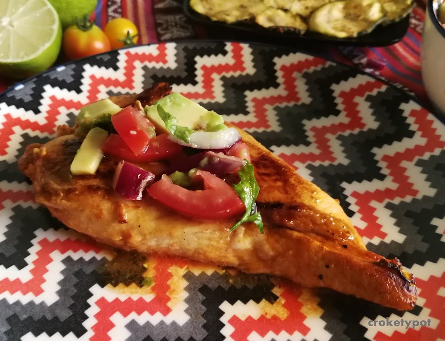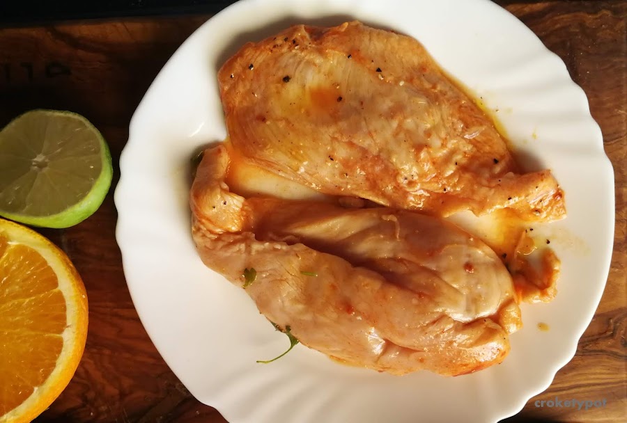 INGREDIENTES: Para 2 personas, 1 pechuga de pollo partida por la mitad, 1/2 cucharada de pimentón dulce, 1/2 cucharada de comino, 1/2 cucharada de ajo en polvo o 2 ajos machacados, 1 cucharadita de chile o guindilla en copos según nos guste el picante, media naranja cortada a rodajas, el zumo una lima, perejil picado o cilantro (tengo que contar que no me gusta el cilantro) 2 cucharadas de aceite AOVE, 2 cucharadas de cerveza, sal y pimienta.