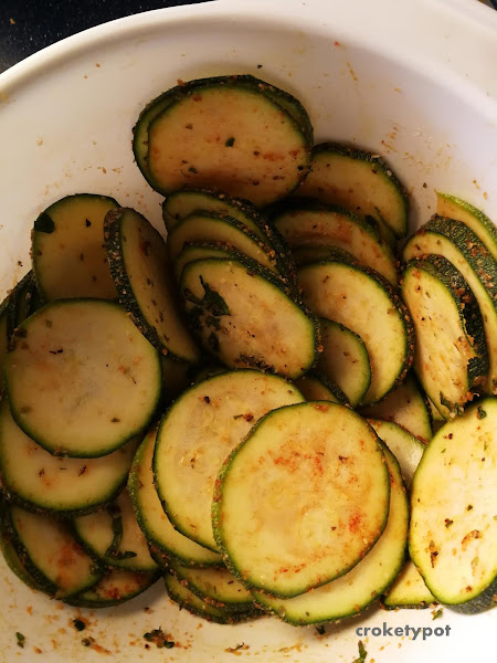 Partimos el calabacín bien limpio, a cuchillo a rodajas lo más finas que podamos, si no tenemos mandolina como es mi caso. Ponemos el calabacín en un recipiente y le añadimos las especias, lo dejamos macerar una hora.