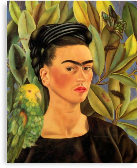 El cuadro que tenemos hoy como tema de nuestros platos, tiene una historia de trasfondo, en esta época, ella estaba en San Francisco, con Diego Rivera, donde contrajo matrimonio, así estando allí Frida recibió la noticia de que su padre, Guillermo Kahlo había muerto. Tras esa dura noticia, la artista se traslado a su casa familiar en Coyoacán, México, a vivir. Y allí instalada, pintó este autorretrato. Por eso la vemos vestida de negro, cosa poco frecuente en sus cuadros, que siempre tiene el fabuloso tocado de flores, aquí muestra el luto que sentía por su padre. En su hombro está su querido loro Bonito, que según dicen también había muerto recientemente. No lleva las características joyas, contrasta tan sólo la mariposa negra y el insecto que hay en las hojas. En esta pintura, Frida, muestra su tristeza y la soledad con la que está viviendo una época de pérdidas en su vida.