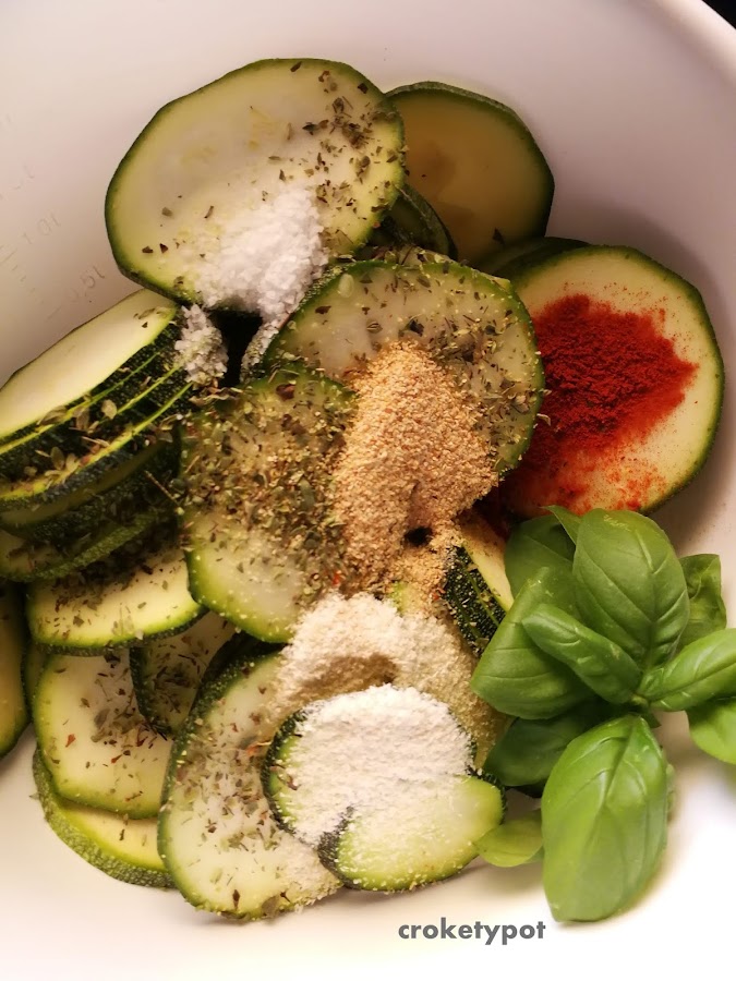 ELABORACIÓN DEL CALABACÍN DESHIDRATADO (opcional): Para un calabacín de 600 gr. 1 cucharada de orégano, 1/2 de ajo en polvo, 1/2 de cebolla en polvo, 1/2 de sal, 1/2 de pimentón dulce, un poco de pimienta negra molida, y albahaca fresca si tenemos.