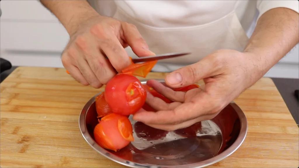 Ahora partimos los tomates pelados. Puedes hacerlo con un cuchillo simplemente pero yo te enseño una técnica fácil para pelar tomates en pocos segundos en mi receta de tomate en conserva.