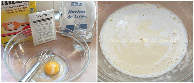 Batimos 1 huevo y añadimos la harina, la maizena y la cta. de levadura en polvo. Con las varillas iremos mezclando poco a poco y al mismo tiempo iremos incorporando el vaso de agua que nos ayudará a disolver las harinas con más facilidad. Le ponemos una pizca de sal y dejamos esta pasta reposando para hacer lo demás.