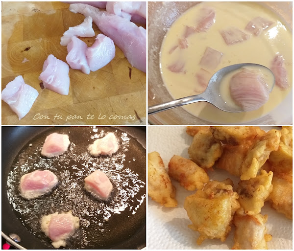 Elaboración:1. En primer lugar preparamos el rebozado, que dejaremos reposar mientras cortamos el pollo y hacemos la salsa.