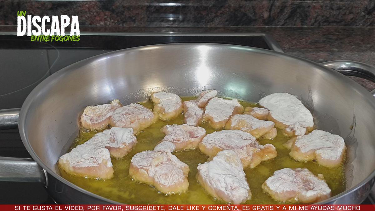 Cuando el aceite ha cogido temperatura, añadimos los trozos de pollo y dejamos que se vaya dorando.