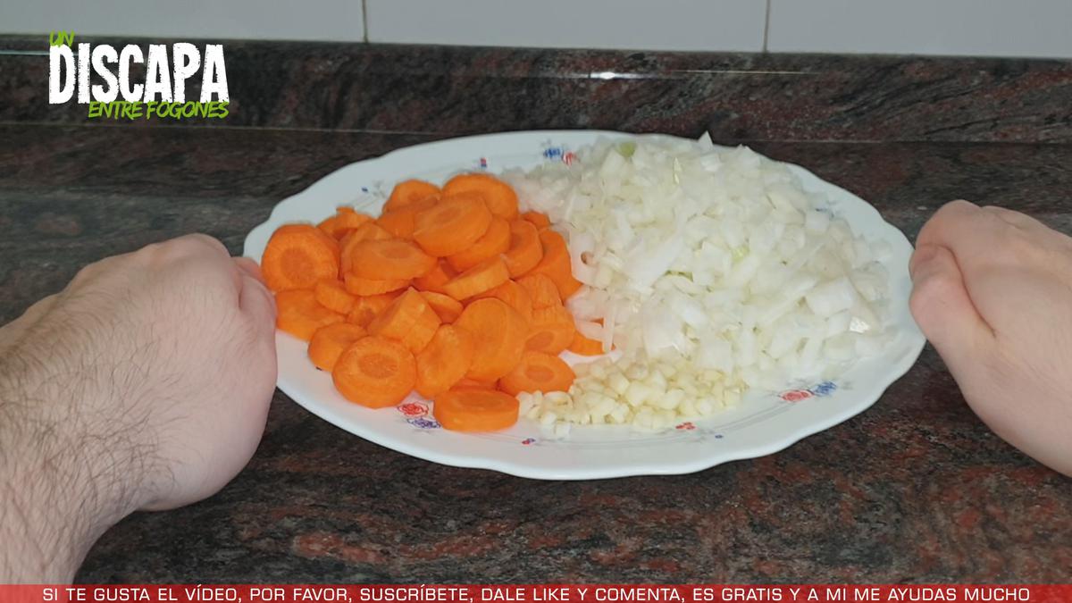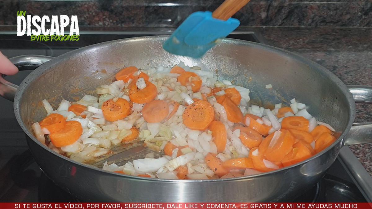 Ahora pelamos 3 zanahorias y las cortamos en rodajas, más o menos de este tamaño.