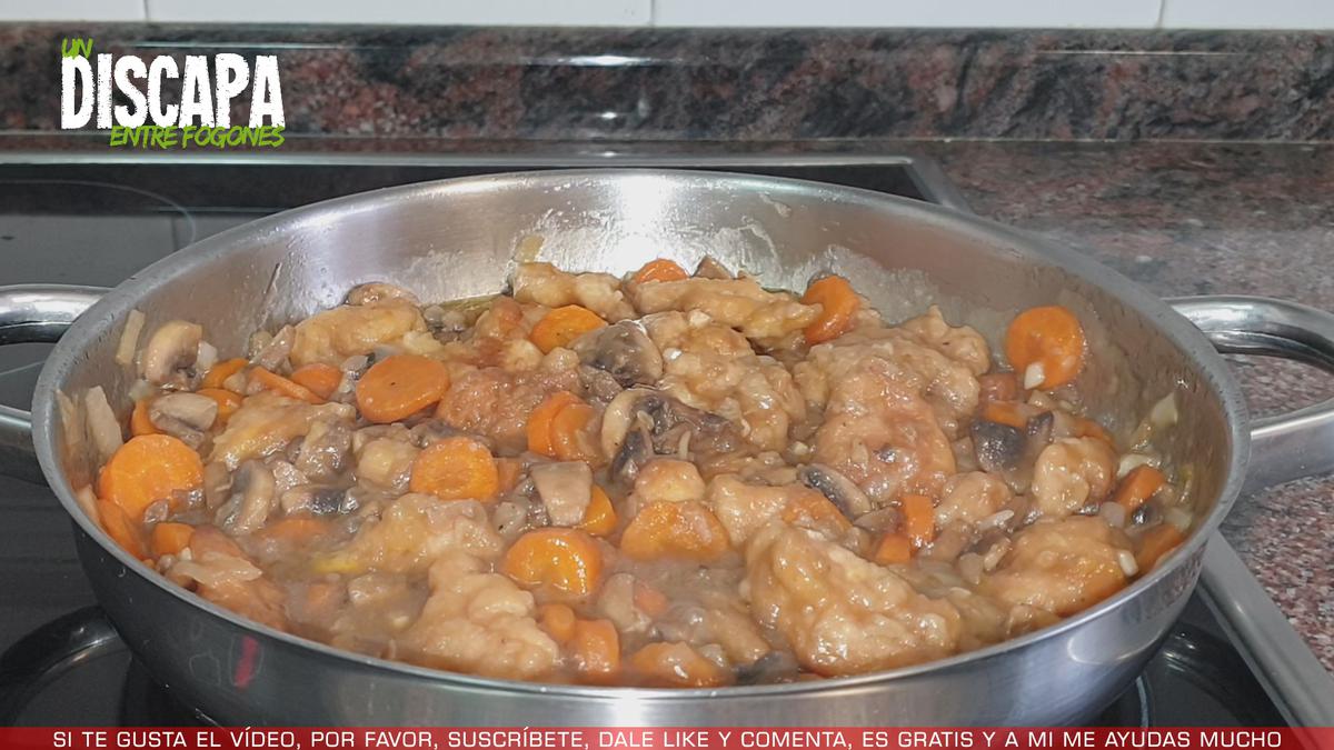 A continuación añadimos el pollo que teníamos reservado y si ha soltado algo de jugo pues también se lo añadimos.