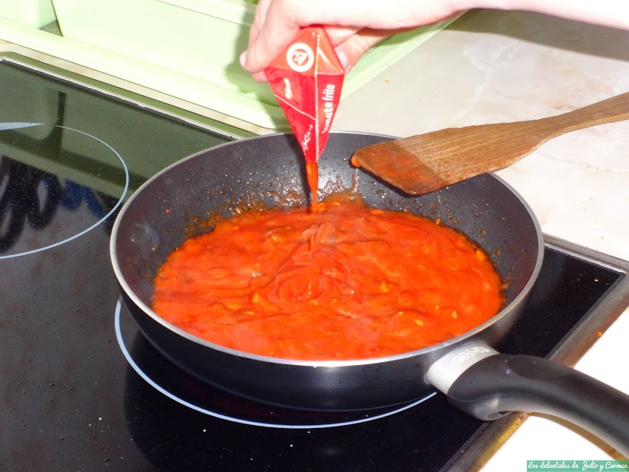 Cuando este dorado, verteremos el jamón serrano para que se tueste un poco. Echamos el tomate frito bajando un poco el fuego y lo removeremos bien unos minutos para que no se nos pegue.