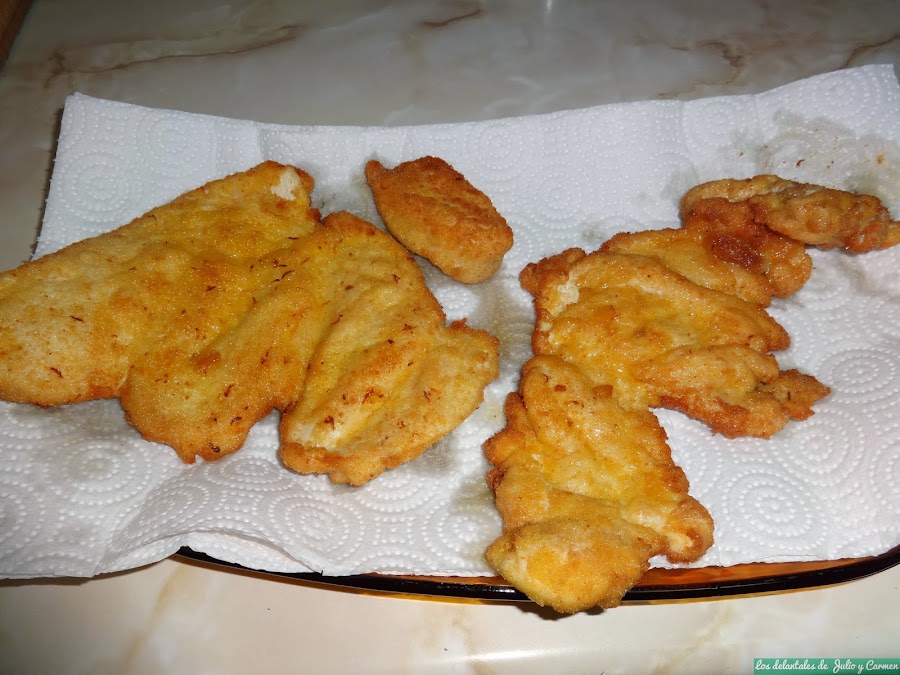 Salamos ligeramente los filetes y los pasamos por el huevo batido y por la mezcla de pan rallado y limón. Los freiremos en una sarten con abundante aceite hasta que estén dorados. Sacamos y los dejamos escurrir sobre papel absorbente.