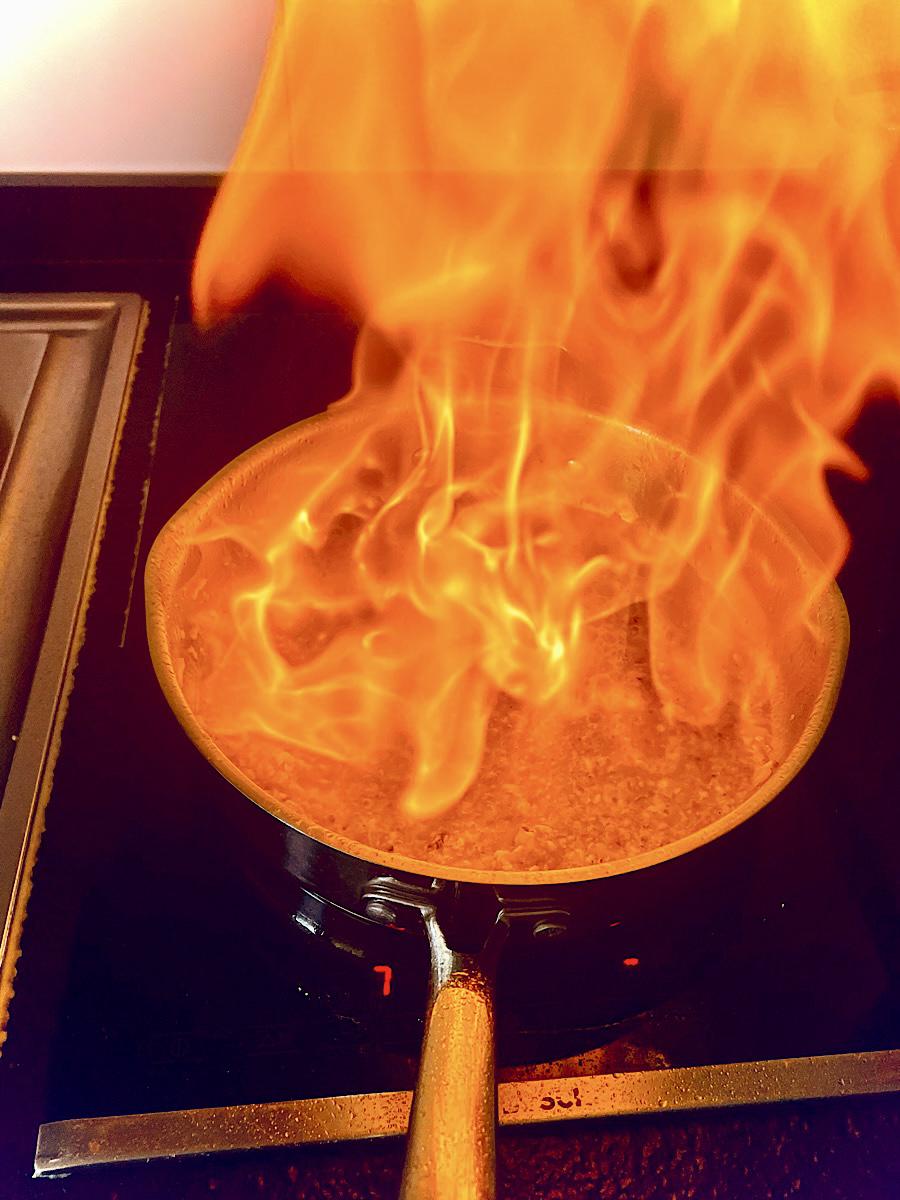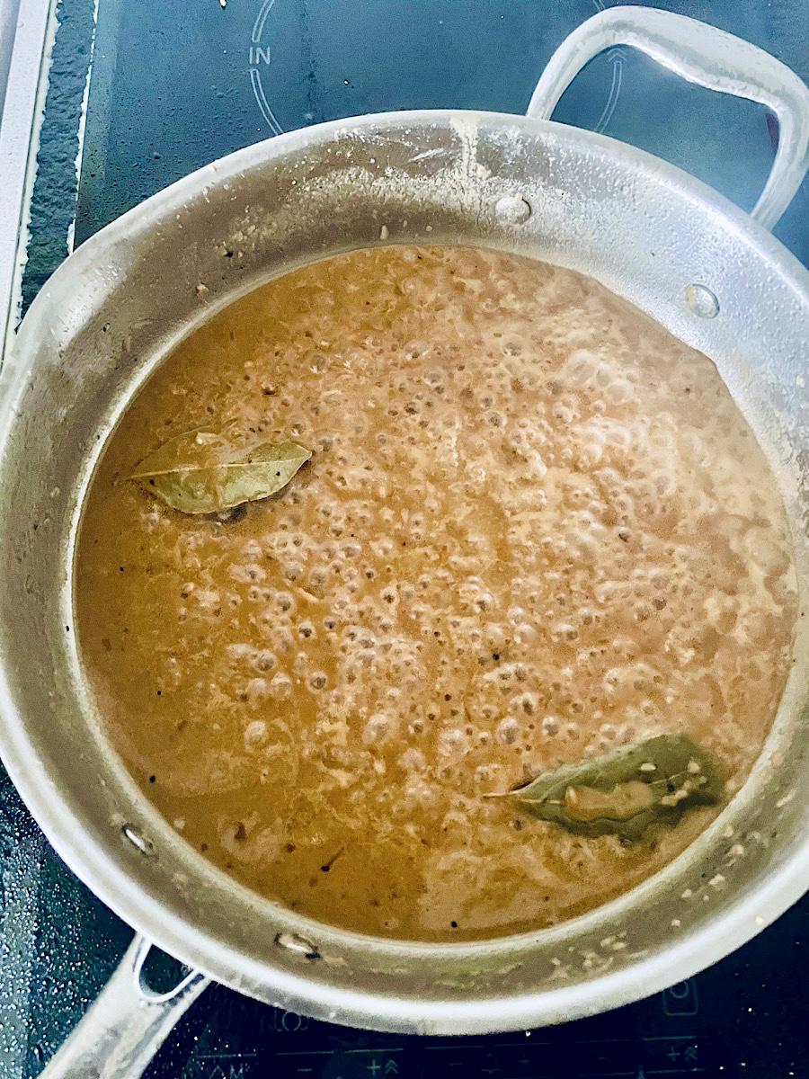 3. Agregamos el brandy y flambeamos, cuando se apague la llama, añadimos el vino blanco y reducimos un par de minutos o hasta que ya no notemos el olor a alcohol, ahora añade el caldo de pollo y el laurel, reducimos 5 minutos a fuego fuerte y agregamos la mostaza y cocinamos un minuto.