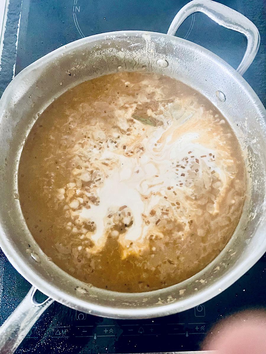 4. Bajamos el fuego a medio y echamos la nata (crema de leche), removemos suavemente hasta homogenizar, agregamos sal y pimienta, se generoso con la pimienta y por último el tomillo picado, cocinamos 2 minutos.