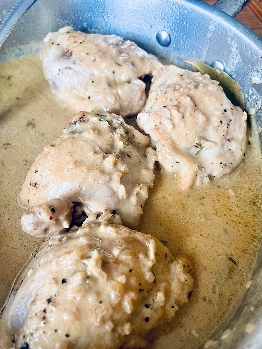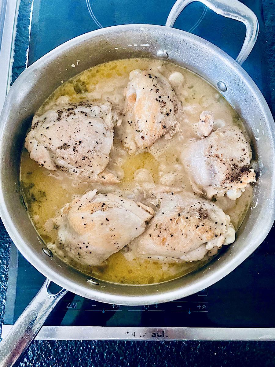 5. Ahora metemos el pollo reservado en la preparación, tapamos y cocinamos a fuego medio 12 minutos. Pasado el tiempo, quitamos la tapa y cocinamos 4 minutos más. Terminado el tiempo, apagamos el fuego y dejamos reposar 2 minutos, servimos y decoramos con más tomillo.